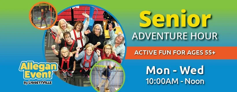This August, Allegan Event invites active seniors age 55 and up to experience the thrill of adventure in a safe, supportive, and fun environment with our Senior Adventure Hour—a special promotion dedicated to celebrating strength, agility, and social connection. Available Monday through Wednesday from open to noon, this limited-time offer allows seniors to enjoy our indoor high ropes course and zip rails for only $12 per person!